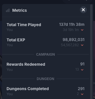We added a feature that lets players view their character's metrics, such as total playtime and the number of items gathered. Players can also view and compare these metrics with other characters, adding a competitive and fun way to track progress.