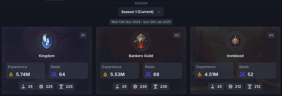 Guild seasons were introduced to bring a competitive edge to guilds. Each season lasts 60 days, with rankings determined by the total experience gathered by a guild during that time. At the end of the season, the top 25 guilds earn rewards based on their final standings.