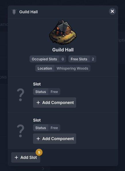 To add a component to the guild, the guild hall must have a free slot. If the guild hall does not have a free slot, you can either remove an existing component, or build a new slot which will cost resources.