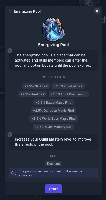The strength of the boosts is directly tied to the guild’s Mastery Experience - so if you have a low Mastery level, don’t expect anything too powerful. On the other hand, higher mastery levels will make the Energizing Pool a valuable tool.