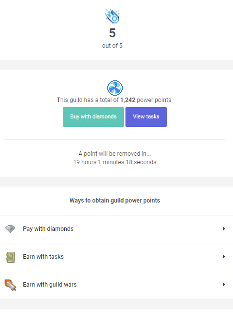 - A guild can have an infinite amount of power points but level 5 is the highest power level.