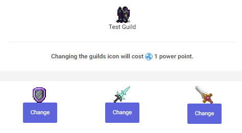 A guild leader can now change the guilds icon to a sprite that they have within their collection. The guild needs to have at least a power level of 3 to do this. It will cost 1 power point to make a change.