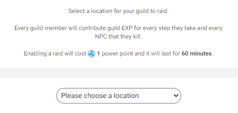 A guild can choose to raid a particular location. When a raid has been activated, every NPC kill and step that a member takes will contribute to the guilds experience points. Raiding a location costs 1 power point and lasts for 60 minutes*.